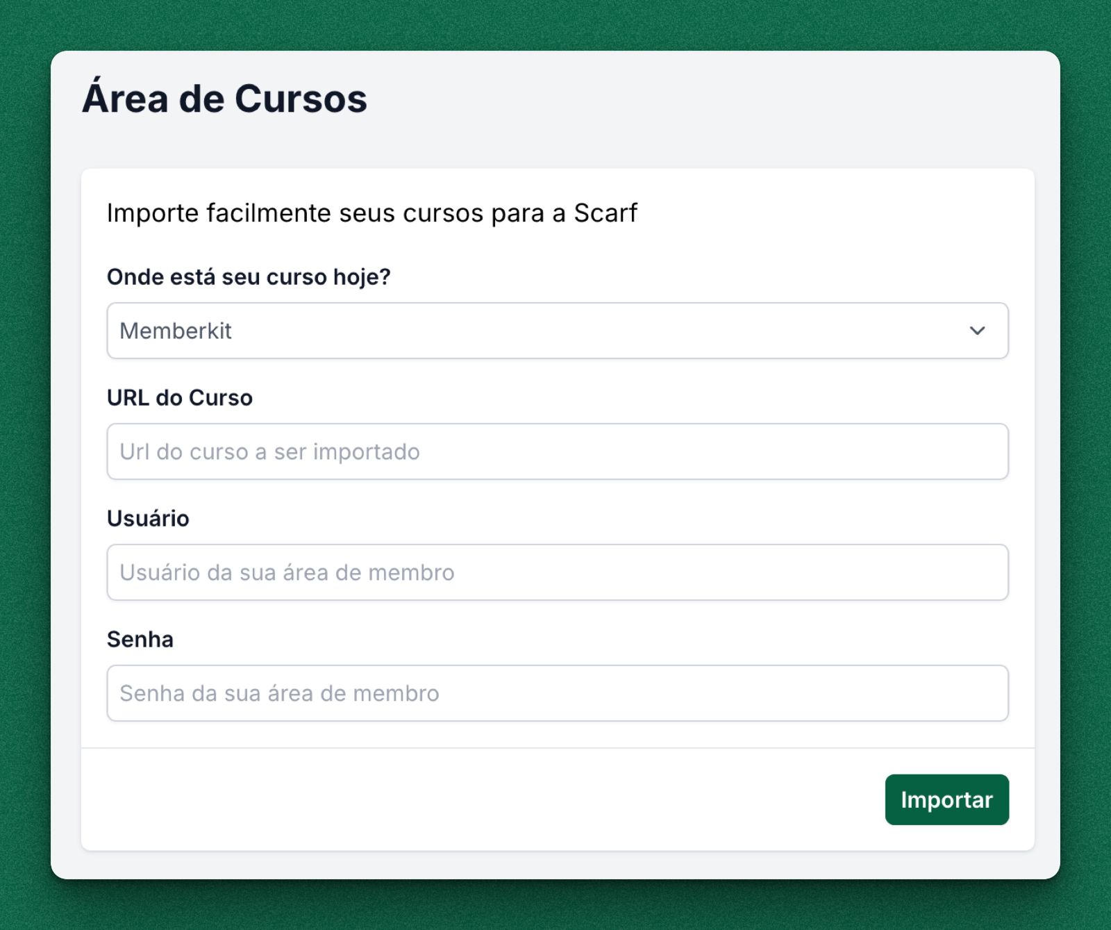 Para chegar na zona de importação de cursos da Memberkit, basta ir na área de cursos do painel de administração e clicar em “Importar Curso” e depois escolher a “Memberkit” como a plataforma.