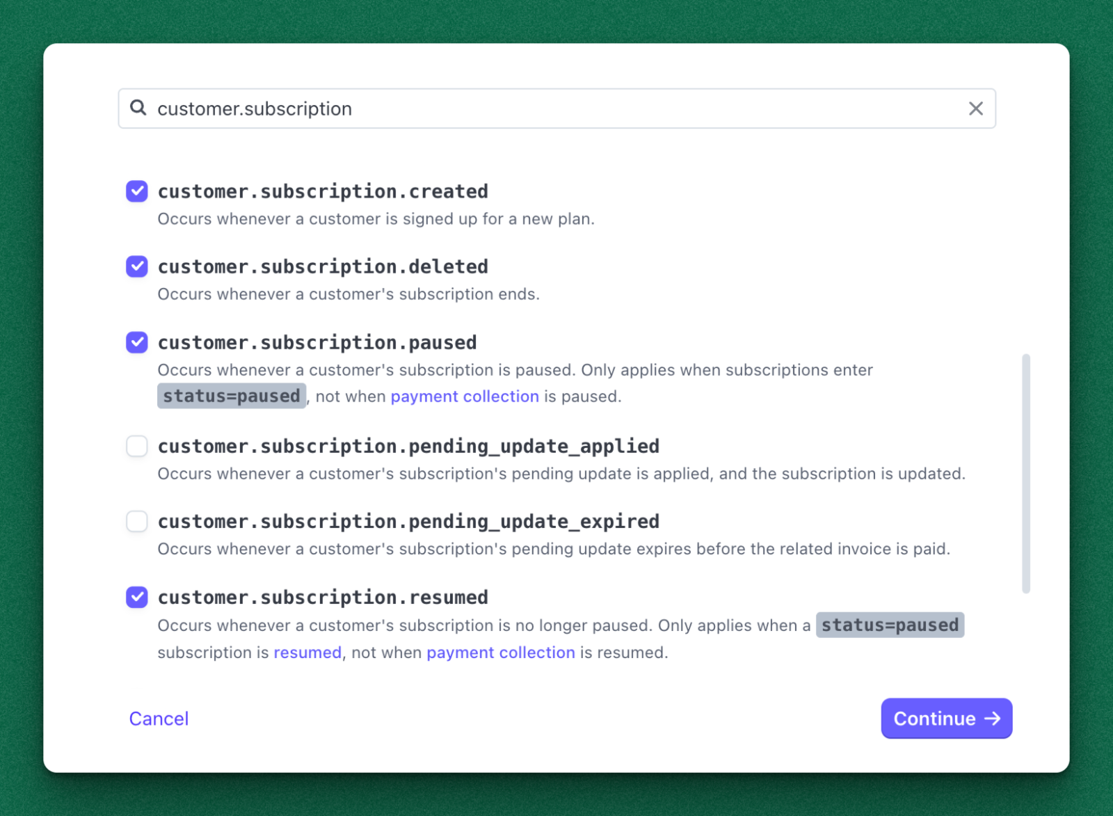 - Em eventos, preciso digite “customer.subscription” e selecione os seguintes:
