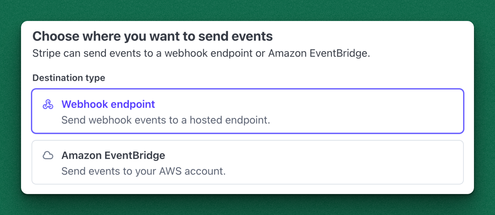 - Deixe selecionado “Webhook endpoint” e clique “Continue”