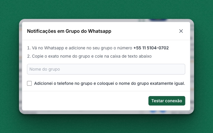 - Clique na caixinha para garantir que colou o nome igual e clique “Testar conexão”. Se todos os passos foram seguidos corretamente, a integração já está funcionando.